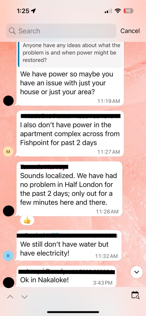 For example, every morning, we wake up to ask the question “Is electricity and water on”? We have a small community WhatsApp group that is regularly messaging about power or water issues. It’s an every day thing! We are used to it, mostly. But there are time when electricity or water has been off longer than anticipated, so we have to ask others to determine if it’s an area issue or only at our home. There is solidarity of community in “suffering” when electricity or water is off for everyone, rather than the panic and going into “fix it” mode when it turns out to be just our house.